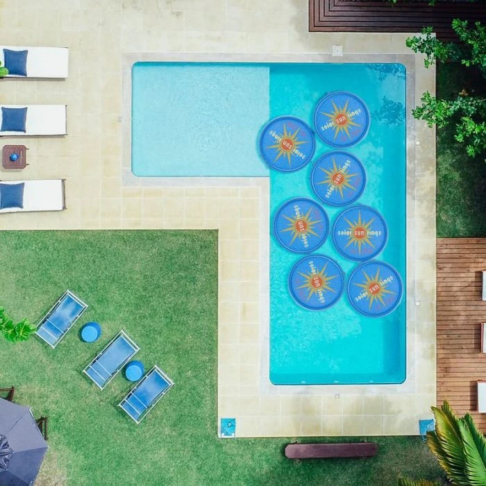 Two layers of heavy-duty vinyl prevent both water and pool chemicals from evaporating through these pool solar rings. In fact, you will save water and chemicals about equal to the percentage of the surface area covered. Once your pool water has reached a comfortable temperature, the Solar Sun Rings may be turned over to conserve water, limiting evaporation without significantly heating the water. A convenient, easy-to-use alternative to large swimming pool solar covers. We recommend purchasing enough pool solar rings cover 70% to 80% of your pools surface, ignoring the small triangles between the rings. Each ring is 5 ft wide, or 60″ in diameter.