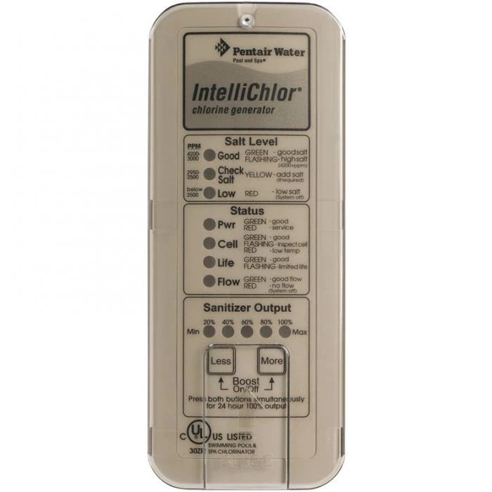 The Pentair IntelliChlor Salt Chlorinator turns salt into chlorine right in your pool automatically! Salt chlorine generation with an IntelliChlor pool chlorine generator is the easiest, most effective, and convenient way to keep your pool water sparkling clean and sanitized. An Eco Select Choice: Using only salt (NaCl), the IntelliChlor Salt Chlorinator automatic chlorine generator creates pure chlorine and eliminates the need to buy, store, and add harsh chlorine products manually. Enjoy great superior water purity, without all the drawbacks. With new standards in chlorine generator technology from Pentair, generating safe and pure pool water is a simple and automatic process. You’ll love the maintenance convenience as much as the superior water quality. IntelliChlor salt chlorine generators are better for you, better for your pool, and better for our planet. A user-friendly control panel makes the Pentair IntelliChlor easier to use than ever. With full diagnostic capabilities, this salt chlorine generator captures all performance data daily. Push-button operation and easy-to-view displays enable fast checking of salt levels, cell cleanliness, sanitizer output, and water flow. Features cell blades rated for 10,000 hours of operation five years of reliable chlorine output under normal operating conditions. Automatic shut-off protects your unit and conserves energy. On-time cycling prevents calcium and scale build-up to maximize cell life. Pentair IntelliChlor chlorinators are NSF approved and certified to UL 1081 standard for safety.