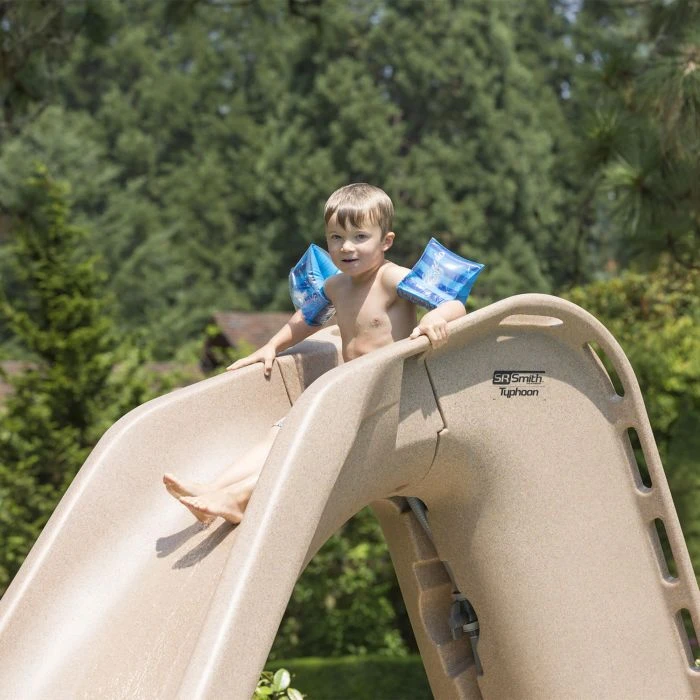 This full sized pool slide standing 7 ft 4 in. tall the Typhoon will provide hours of entertainment and fun for anyone ready and willing to take the plunge! New molded-in handgrips provide maximum safety for your smaller users. Also it’s new GrandRapids water delivery system features a larger volume of rushing water ensuring ease of slippery slide fun. Available in sandstone and gray granite. 7 ft 4 in. to top of handrails.